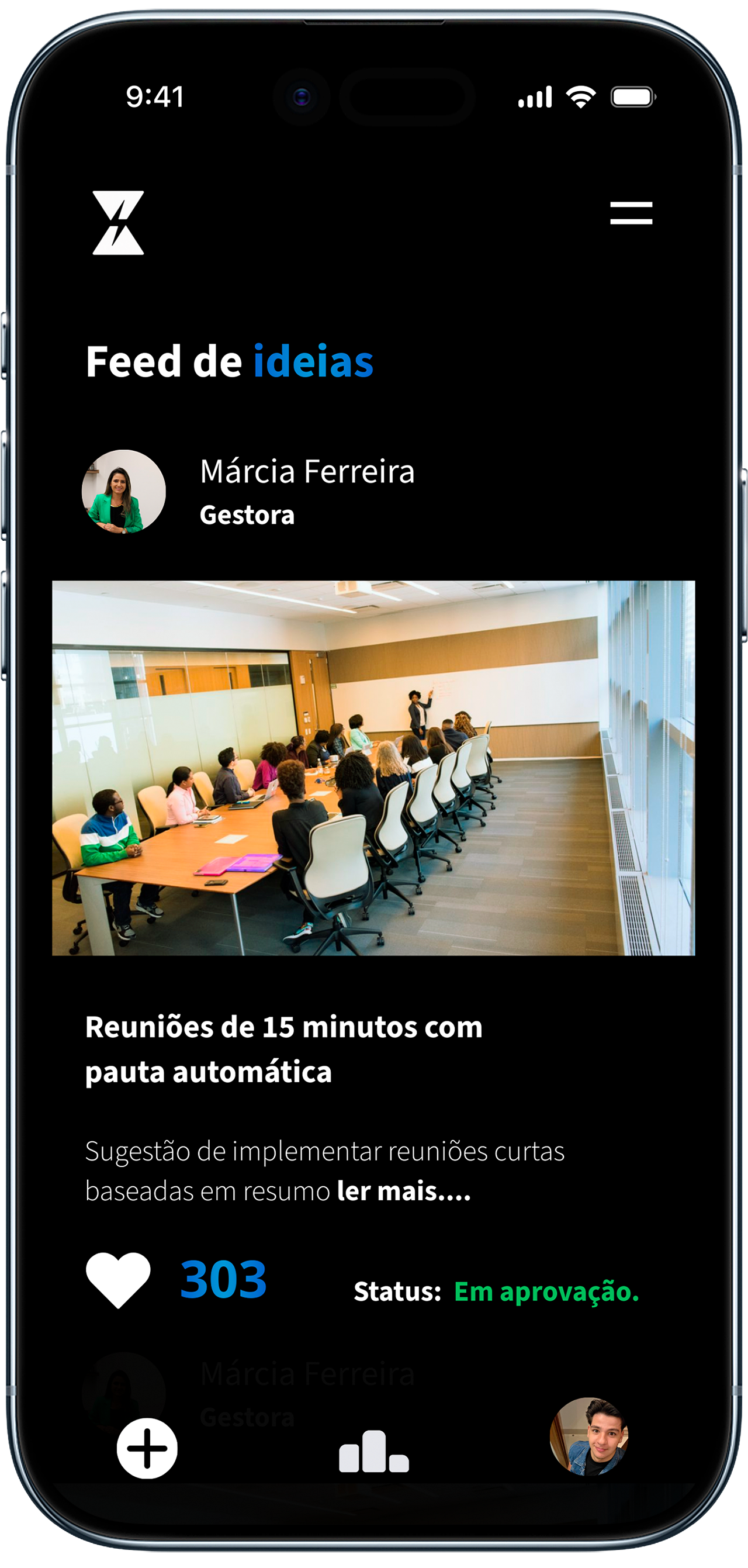 O feed é onde tudo acontece. Os colaboradores publicam ideias, comentam, votam e ajudam a empresa a enxergar rapidamente o que tem potencial. É dinâmico, transparente e fácil de usar — parece uma rede social interna focada em inovação.
