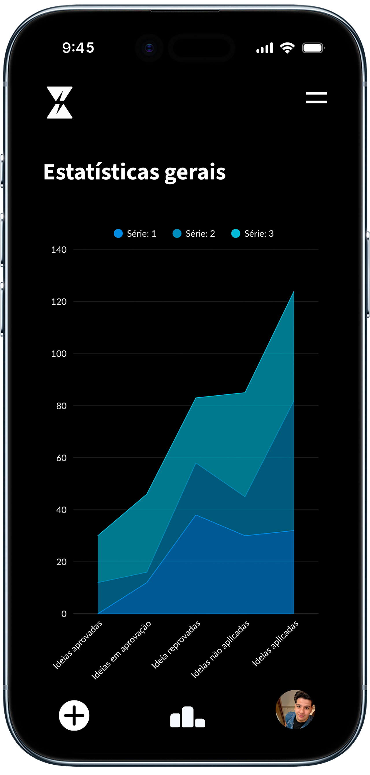 O dashboard traduz toda a movimentação da plataforma em métricas reais: volume de ideias, impacto potencial, engajamento do time, tempo de implementação e muito mais. É a visão que gestores nunca tiveram — e que transforma inovação em resultado.